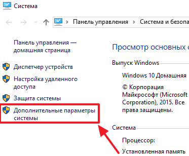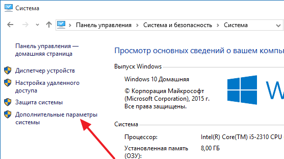 Для того чтобы выполнить данную процедуру нужно открыть «Панель управления» и перейти в раздел «Система и безопасность – Система» либо использовать комбинацию клавиш Windows+Pause. А после того, как откроется окно «Просмотр основных сведений о вашем компьютере» перейти по ссылке «Дополнительные параметры системы».