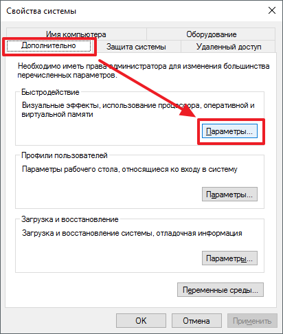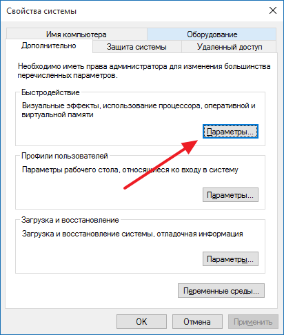 Дальше необходимо открыть вкладку «Дополнительно» и нажать на кнопку «Параметры» в разделе «Быстродействие».