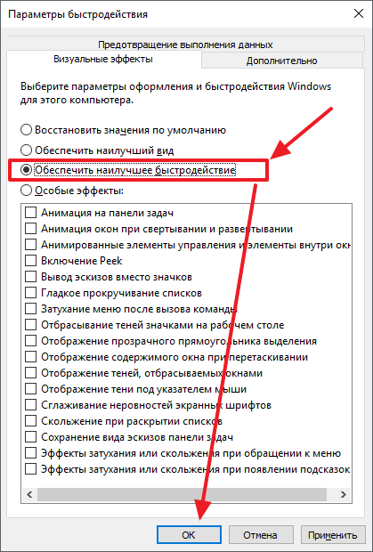Таким образом вы отключите все визуальные эффекты операционной системы Windows 7 или Windows 10. На слабых компьютерах это дает некоторое улучшение производительности.