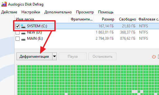 Для дефрагментации можно использовать встроенные инструменты либо сторонние программы. Для примера продемонстрируем, как это делается с помощью бесплатной программы Auslogics Disk Defrag Free.