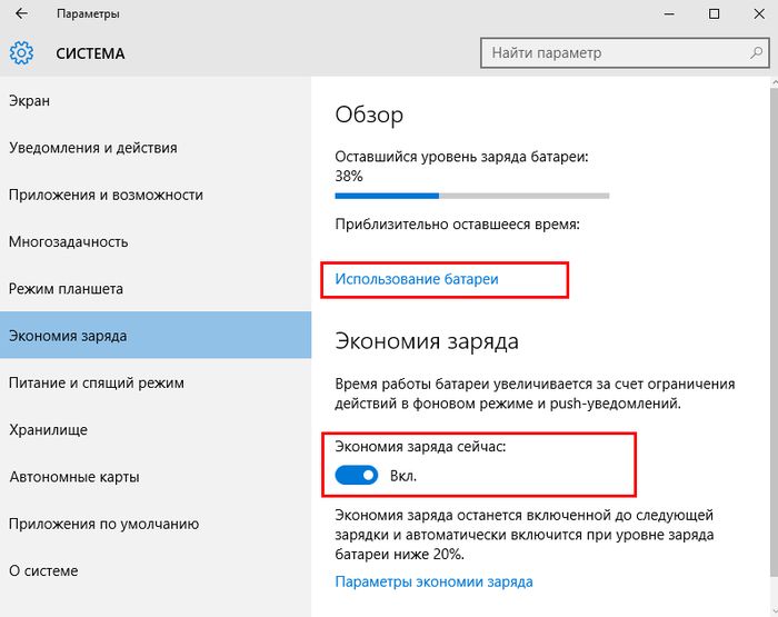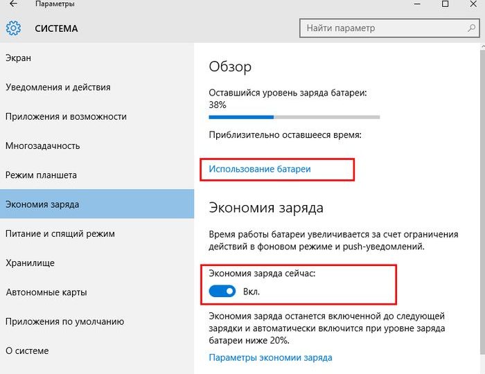 Определить, какое приложение потребляет больше всего ресурсов очень просто. Для этого в Windows 10 есть встроенная утилита Battery Saver с удобным графическим интерфейсом. С ее помощью можно не только узнать объем потребляемой каждым приложением энергии, но и настроить его активность. Откройте «Параметры», перейдите в раздел Система -> Экономия заряда и нажмите ссылку «Использование батареи».