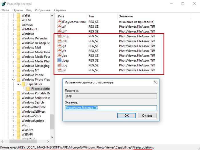 В последнем подразделе вы увидите два параметра с именами как раз тех самых двух форматов, о которых говорилось в предыдущих абзацах. Тут же создайте новый параметр типа REG_SZ (обычный строковый) с именем .jpg и значением PhotoViewer.FileAssoc.Tiff. Точно такие же параметры создайте для форматов bmp, dib, jpe, gif, jfif, jpeg, jxr и png.