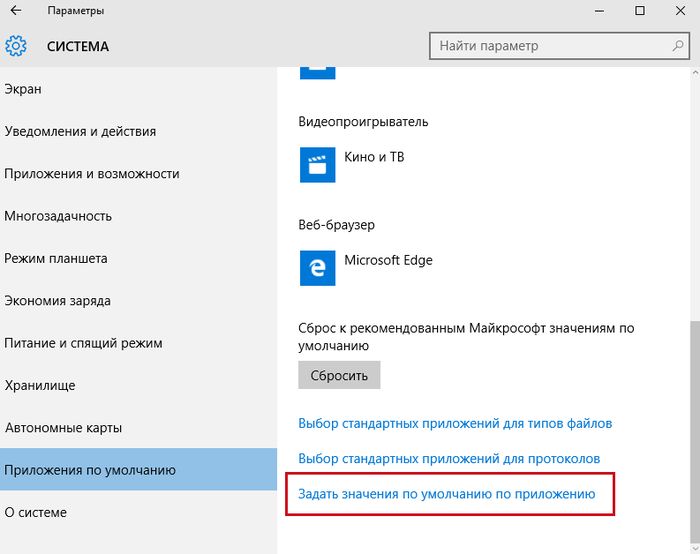 После этого откройте приложение «Параметры» и далее перейдите Система -> Приложения по умолчанию -> Задать значения по умолчанию по приложению.