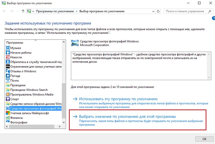 В левой колонке открывшегося окошка выберите приложение «Средство просмотра фотографий Windows», нажмите «Выбрать значения по умолчанию для этой программы»…