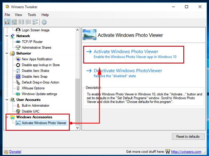 И еще. Тем, кто не хочет возиться с реестром, могу порекомендовать бесплатную утилиту WinAero Tweaker, только вам понадобится самая последняя версия. Запустите ее, прокутите список доступных твиков до самого конца. В конце списка вы обнаружите опцию «Activate Windows Photo Viewer». Воспользуйтесь ею, и вы получите тот же результат, что и при ручной правке реестра.