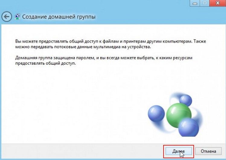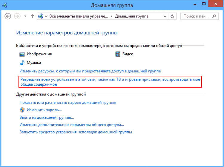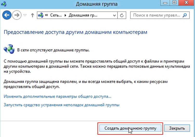 Теперь необходимо соединить гаджеты, которые подключены к сети, в одну домашнюю группу. Только так они смогут иметь доступ к медиа, расположенным на главном сервере. Для этого нужно выбрать пункт «Создать домашнюю группу».