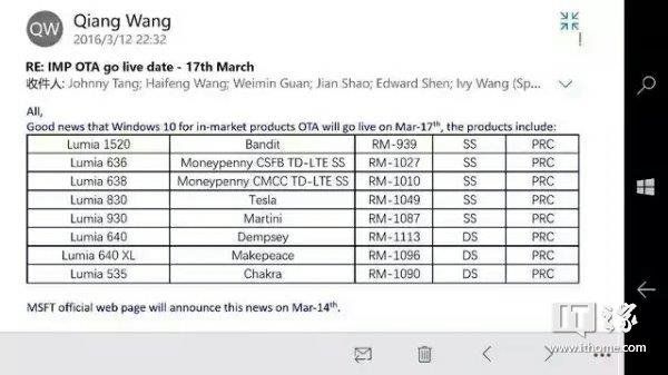 Об этом твердят новые слухи из Китая, подкрепленные скриншотом на форуме ITHome. На нем показано письмо якобы от Microsoft, в котором говорится, что обновление для первой партии устройств начнется 17 марта, а о готовящемся начале распространения компания объявит сегодня (14 марта).