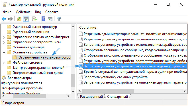 10. В подкаталоге находим параметр «Запретить установку оборудования с указанными…».