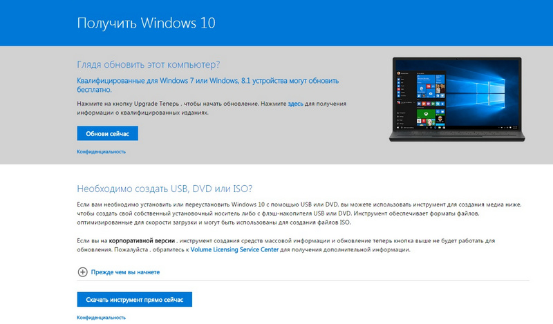Начнем с того, что вам необходимо скачать инструмент для работы с Windows 10 — «Media Creation Tool» (скачать утилиту можно на официальном сайте компании Майкрософт), с помощью которого вы сможете обновить свою операционную систему до Windows 10, создать ISO образ, загрузочный диск Windows 10 или флеш-накопитель.