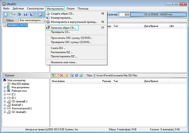 Далее в верхней части главного меню находим и жмем на инструменты. Выбираем «Записать образ CD» и указываем путь файлу, где расположен образ.
