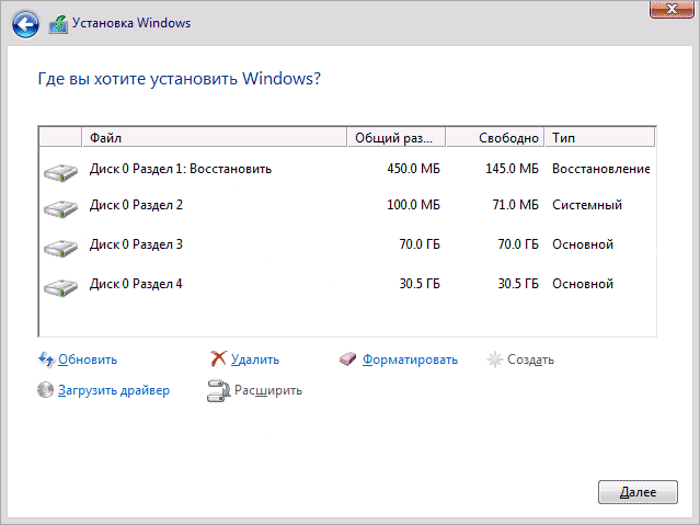- Если операционная система уже была установлена (используется приобретенный компьютер без ОС, с чем сейчас фактически не столкнуться), кроме созданных пользователем разделов будет показано еще несколько дополнительных томов, объемом в сотни мегабайт, а также зарезервированные системой диски. Эти неизвестные для новичка разделы лучше не трогать: на одном из них хранится загрузчик, на втором — копия «десятки», позволяющая выполнить сброс ОС к изначальному состоянию.