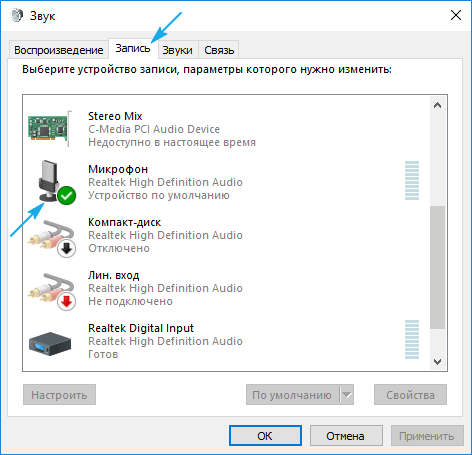 3. Идем во вкладку «Запись» и проверяем, чтобы возле микрофона стояла зеленая пиктограмма в виде галочки в кружке.