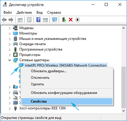 Также зайдите в «Диспетчер задач» и вызовите «Свойства» сетевой платы.