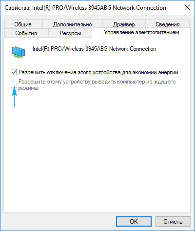 Во вкладке «Управление электропитанием» снимаем флажок, который стоит возле пункта, разрешающего сетевой плате выводить ПК с режима ожидания.