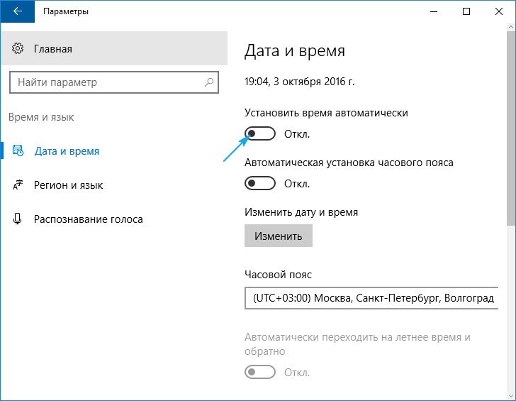 - Переводим переключатель, отвечающий за автоматическую установку времени в положение «Откл.», затем обратно активируем опцию.