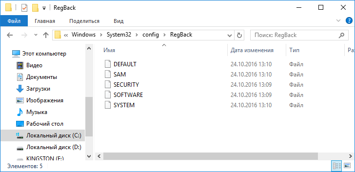 Десятка периодически создает снимки реестра (это делается всегда перед инсталляцией обновлений), которые помещаются в директорию «System32configRegBack», размещенную в папке с операционной системой, а большинство оригинальных файлов реестра всегда располагается по адресу «System32config» в том же каталоге. Это SAM, DEFAULT, SYSTEM и прочие. Все они не имеют расширения.