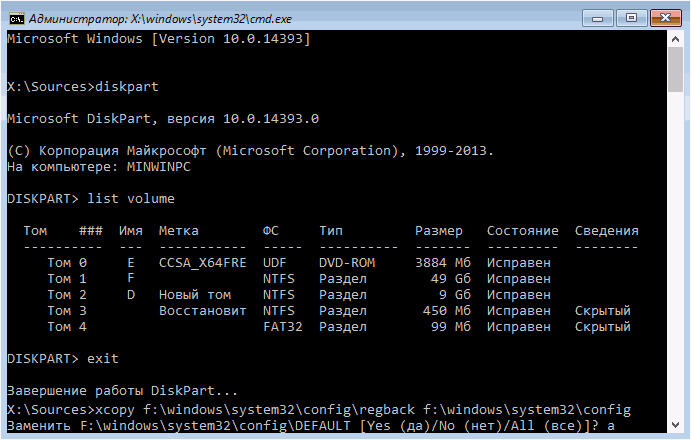 xcopy F:windowssystem32configregback F:windowssystem32config, где вместо F вводим метку вашего системного раздела.