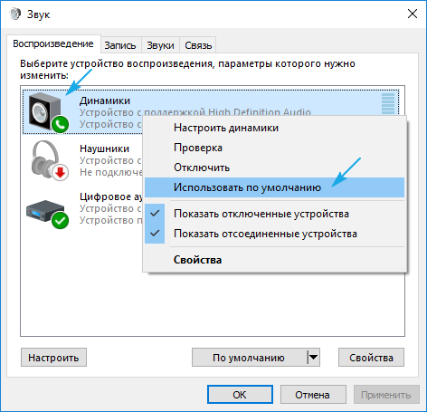 4. Вызываем контекстное меню их иконки и жмем «Использовать по умолчанию», чтобы сделать колонки девайсом для проигрывания звука.