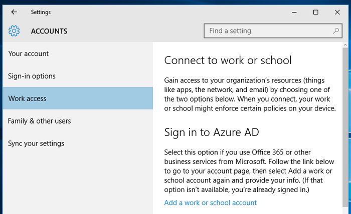 В Параметры -> Учетная запись -> Рабочий доступ теперь можно подключиться к ресурсам компании или образовательного учреждения, используя учетную запись Azure AD или устройство управления.