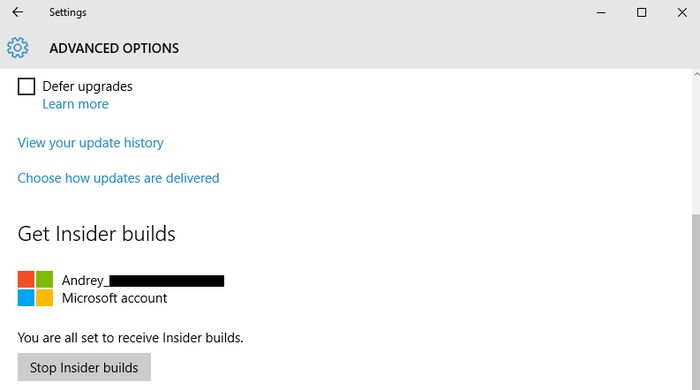 Возможность выбрать другую учетную запись Microsoft для получения предварительных сборок