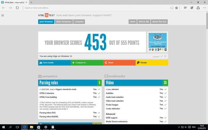 Разработчики дополнительно оптимизировали новый браузер, о чем свидетельствует тест на совместимость с веб-стандартом HTML5, в котором результат Edge увеличился с 397 до 453 пунктов.