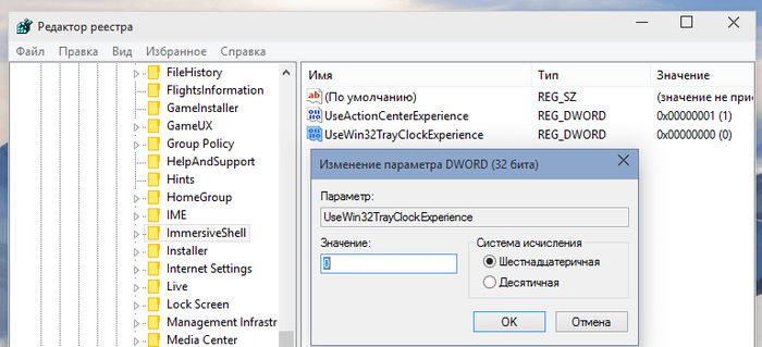 Чтобы вернуться к старому интерфейсу, просто удалите параметр UseWin32TrayClockExperience, или измените его значение на 1.