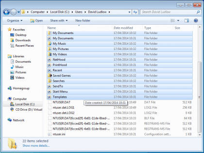 Установите следующие опции - Выберите все файлы в вашей директории, кроме начинающихся на Ntuser.dat, Ntuser.ini, Ntuser.dat.log.
