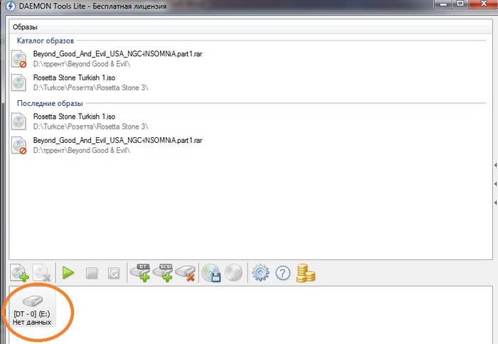 - скачиваем программу Daemon tools lite c официального сайта. Устанавливаем ее, в процессе установки выбрав бесплатную лицензию. После установки программы запускаем ее, в нижней части открывшегося окна должен отображаться ваш новый виртуальный привод;