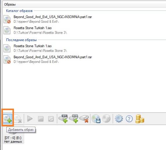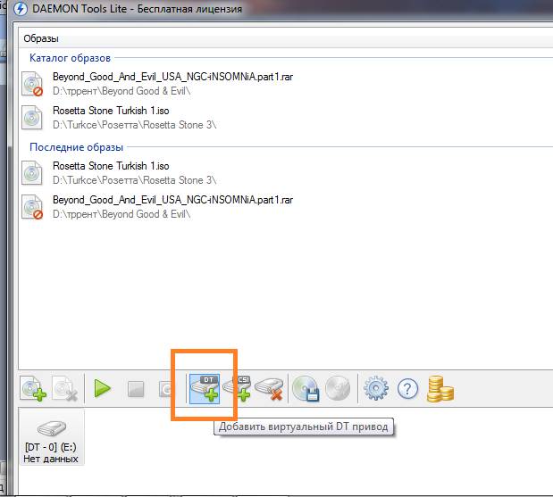 - запускаем программу. Если после ее установки привод по какой-либо причине не появился, выбираем во вкладках ярлык со значком DT – добавить виртуальный DT привод, который теперь будет отображаться вместе с жесткими дисками и другими устройствами;