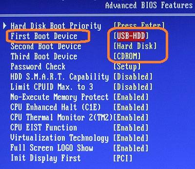 - некоторые варианты БИОСа позволяют выбрать USB-HDD в этом же меню. Но встречаются другие, где сначала нужно выбрать Hard Disk в качестве приоритетного устройства загрузки (First boot device), после чего заходим в пункт Hard Disk Boot Priority, и выставляем приоритет между флешкой или жестким диском, при помощи клавиш «+» и «-». В данном случае нам нужно выбрать установочный USB;