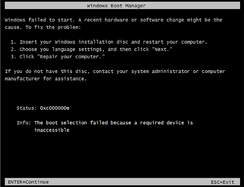 Перезагрузить компьютер. Проблема ошибки 0xc000000e должна быть решенной.