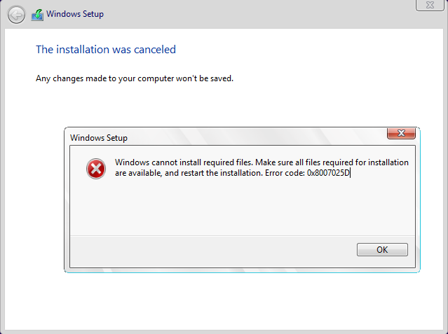 Кроме того, надпись на экране “Windows не удалось установить необходимые файлы 0x8007025d” может сигнализировать еще о двух вещах: