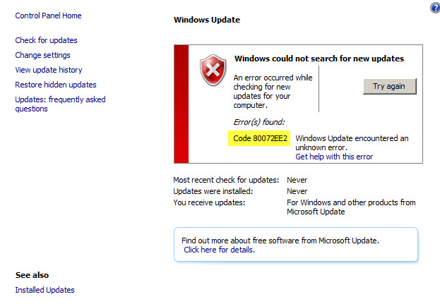 Что это значит? Это обозначает, что во время выполняемого процесса неожиданно прервался контакт между удаленным сервером и ПК человека. Поэтому, хотя и пишется, что произошла неизвестная ошибка Windows Update – код 80072ee2, тем не менее, проблема довольно понятна, а значит, есть способы найти выход из сложившейся ситуации.