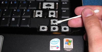 Очистка клавиш ноутбука без съема клавиатуры довольно проста. Для этого, требуется отключить ноутбук и, применяя баллончик со сжатым воздухом,произвести чистку пространство между клавишами ноутбука, затем протереть клавиатуру чистящей жидкостью и сухой фланелевой тряпочкой. На этом процедуру очистки ноутбука, без съема клавиатуры можно считать завершенной. В случае необходимости, с помощью специальной отвертки можно снять клавиши клавиатуры с рычажков и протерев их очищающим средством, установить их на место. Будьте внимательны и осторожны перед этой процедурой. Перед тем, как начать съем клавиш, сфотографируйте раскладку.