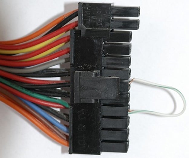 Для этого нужно посмотреть на кабель питания материнской платы, который идет от БП, и найти там зеленый провод. Этот провод нужно замкнуть с любым из черных проводов. Это можно сделать при помощи скрепки или небольшого куска провода (фото внизу).