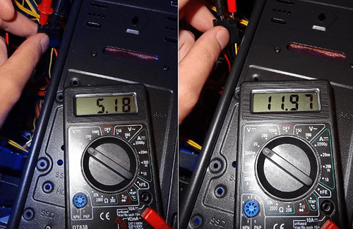 После того как блок питания включился, можно приступать к следующему этапу проверки блока питания компьютера на работоспособность. На этом этапе мы будем проверять напряжения, которые он выдает или не выдает. Для этого берем тестер, выставляем его в режим проверки напряжения постоянного тока и проверяем какие напряжения присутствуют между оранжевым и черным проводом, между красным и черным, а также между желтым и черным (фото внизу).