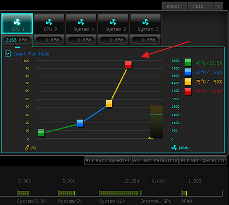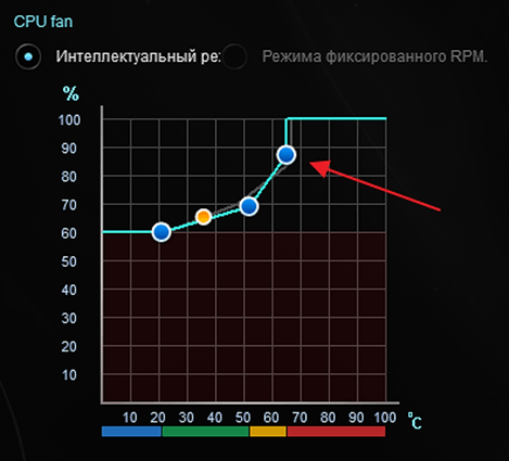 При настройке скорости вращения процессорного кулера важно помнить, что для безопасной работы температура процессора не должна превышать 65-70 градусов. Поэтому для этой температуры нужно выставить максимальную скорость вращения.