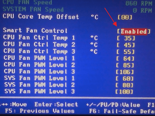 На более старых материнских платах с классическим BIOS также возможна регулировка скорости вращения кулера на процессоре. Только в этом случае настройка производится простым заданием нужных значений скорости кулера, без графика.