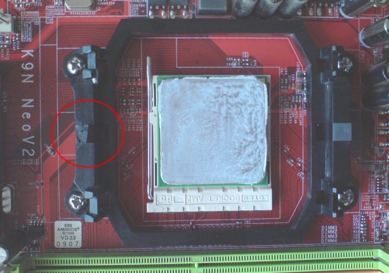 На материнских платах под процессоры AMD крепление кулера устроено несколько иначе, но оно тоже достаточно часто ломается. Там срезается пластмассовый зубчик, за который цепляется металлическая пружинная планка.