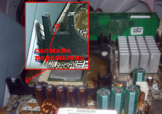 Материнские платы с разъемом процессора Socket 478 наиболее подвержены поломке крепления кулера. Обычно отламываются тонкие перемычки на материнской плате и крепление радиатора на защелкивается.