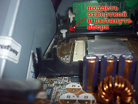 Для этого нужно поддеть отверткой и извлечь фиксаторы, как показано на рисунке ниже.