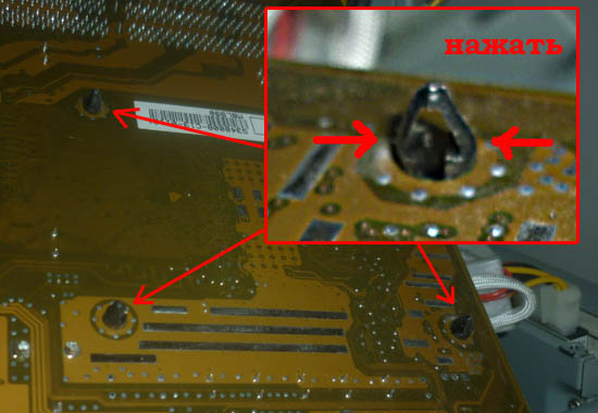 После того, как фиксаторы извлечены можно вытащить само крепление кулера. Для этого нужно сжимая защелки поочередно извлечь их из материнской платы.