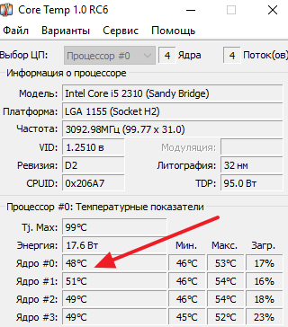 Также вы можете не ждать очередной перезагрузки компьютера, а понаблюдать за температурой процессора в режиме реального времени. Для этого можно использовать различные программы. Например, можно использовать бесплатную программу Core Temp. Запустите данную программу, создайте нагрузку на процессор и наблюдайте за температурой.
