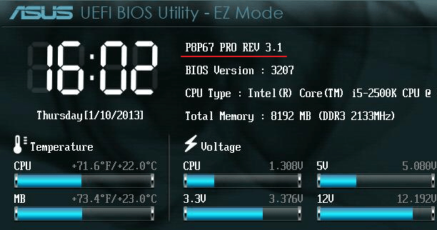 Если у вас современная материнская плата, то во время процедуры POST на экране может не появляться никакой информации. В этом случае название материнской платы можно посмотреть в настройках BIOS. Для этого сразу после включения компьютера, во время процедуры POST, нажмите на клавишу входа в настройки BIOS (обычно это клавиша Delete). В большинстве случае название материнской платы будет указано уже на стартовом экране BIOS.