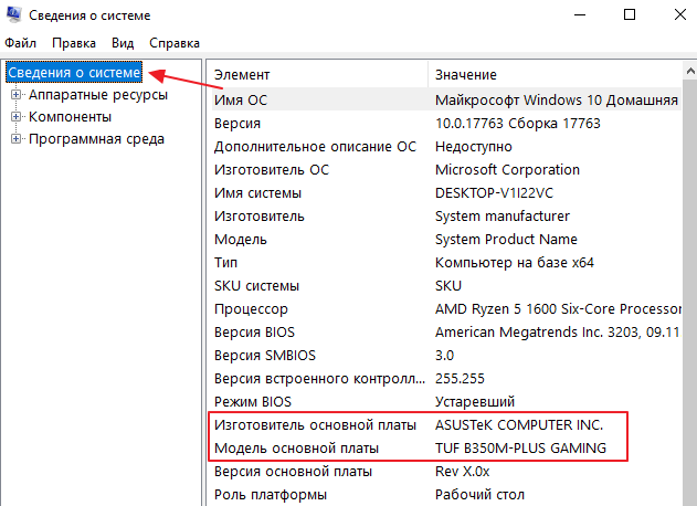 В результате откроется окно «Сведения о системе». Здесь, на главном экране программы, будет собрана все основная информация о вашем компьютере. Среди прочего здесь будет и название материнской платы.