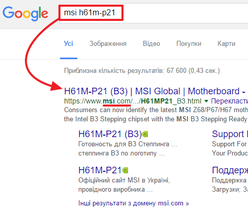 Берем эти данные (производитель материнской платы и модель) и вводим их в любую поисковую систему. После этого нужно изучить выдачу поисковой системы и перейти на официальный сайт производителя. Скорее всего, ссылка на официальный сайт будет в самом верху результатов поиска.