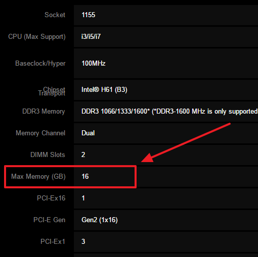 - Объем оперативной памяти не должен превышать максимальный объем указанный в характеристиках материнской платы и процессора.