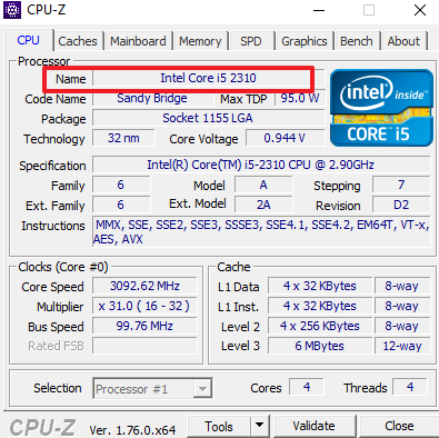 Нужно отметить, что уже достаточно давно, контролер памяти встраивается в процессор, а не северный мост чипсета. Поэтому, нужно проверять не только то, какую оперативную память поддерживает материнская плата, но и то, какую память поддерживает процессор. Делается это точно также. Запускаем CPU-Z и на вкладке CPU смотрим модель процессора.