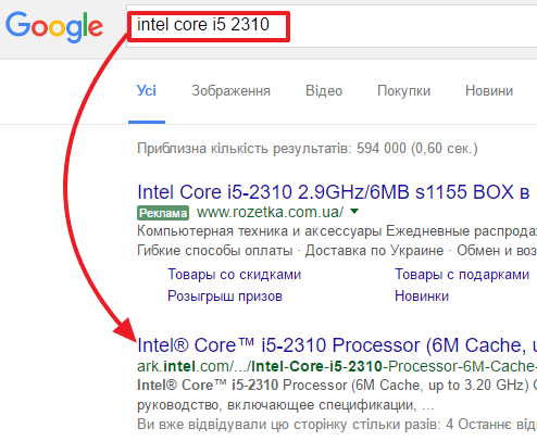 После этого вводим название процессора в поисковую систему и переходим на официальный сайт производителя.