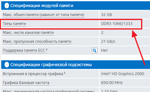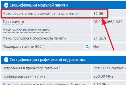 Дальше изучаем характеристики процессора и ищем там упоминание о памяти, которую поддерживает данный процессор.
